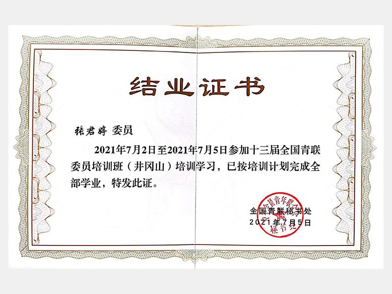 2021年7月2日至2021年7月5日參加十三屆全國青聯(lián)委員培訓(xùn)班(井岡山)培訓(xùn)學(xué)習(xí)(結(jié)業(yè)證書)