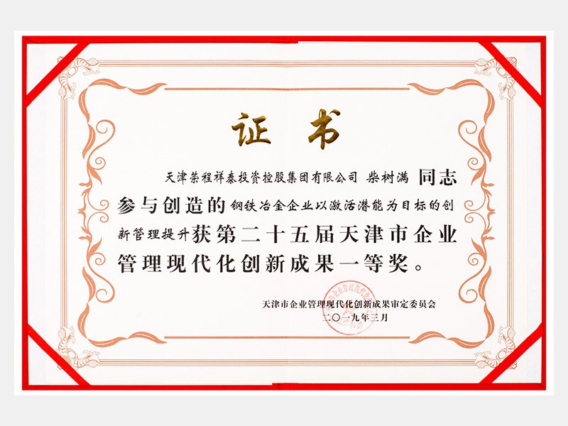 柴樹滿同志參與創(chuàng)造的鋼鐵冶金企業(yè)以激活潛能為目標(biāo)的創(chuàng)新管理提升獲第二十五屆天津市企業(yè)管理現(xiàn)代化創(chuàng)新成果一等獎(jiǎng)。